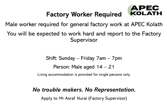 We have no written employment procedure. However, our Factory Supervisor is a good judge of character when it comes to recruiting factory staff.  We currently have a vacancy for a factory worker; this is the advert we have placed on the notice board. Please note that we pay approximately the Tamil Nadu minimum wage rates for all our factory workers.